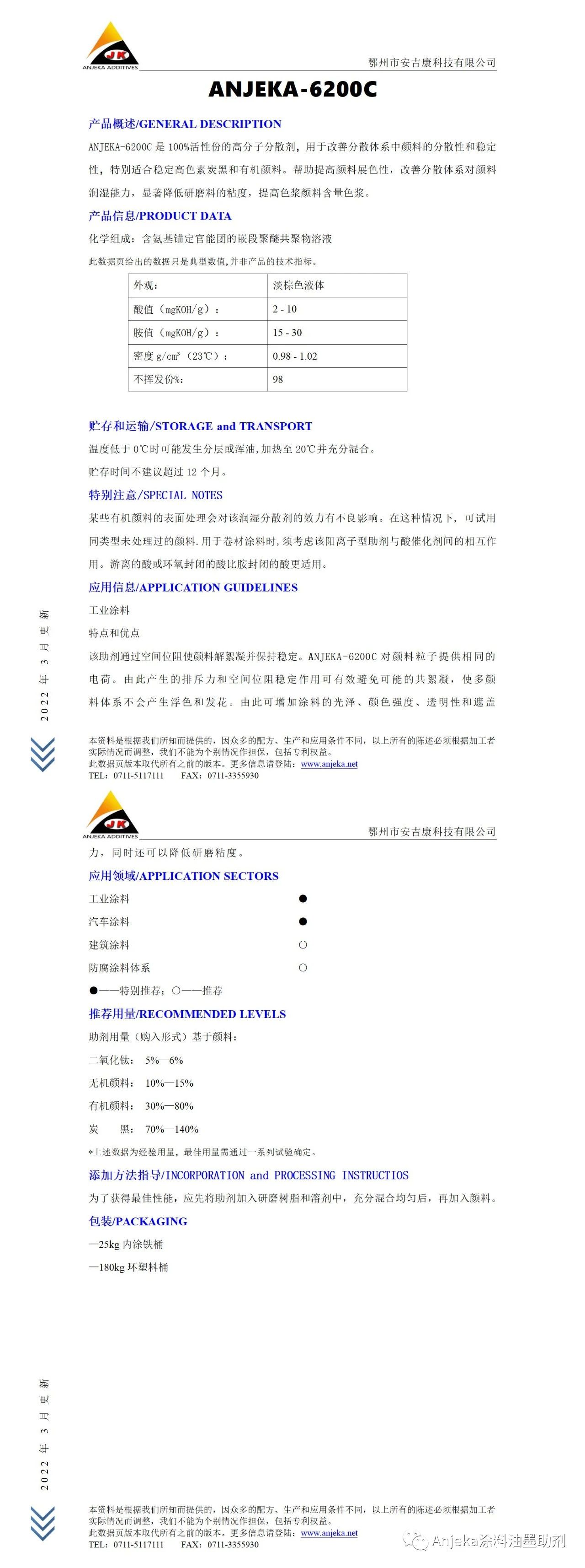 ANJEKA-6200C是100%活性份的高分子分散劑,用于改善分散體系中顏料的分散性和穩(wěn)定性,特別適合穩(wěn)定高色素炭黑分散和有機(jī)顏料。幫助提高顏料展色性,改善分散體系對(duì)顏料潤濕能力,顯著降低研磨料的粘度,提高色漿顏料含量色漿。